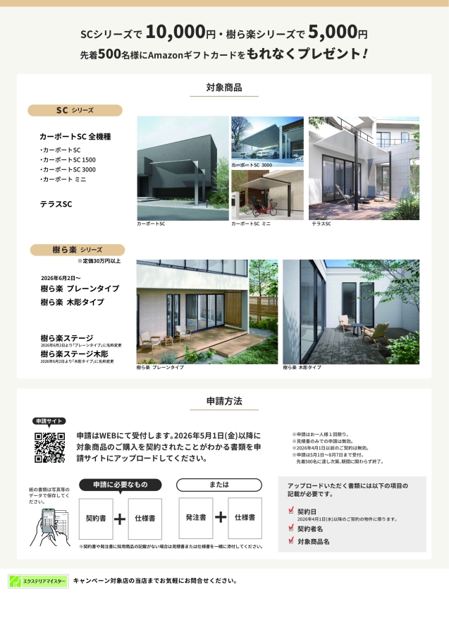 2026.04.20 LIXIL ソトで暮らしアップキャンペーン 2026 LIXILよりキャンペーンのご案内です。 期間内に対象商品をご契約、申請いただきましたお施主様にもれなくプレゼントいたします。 対象商品によりプレゼント金額が異なります。詳しくは下記をご確認ください。 申請は5月1日(金)~8月7日(金)までWEBにて受付します。但し先着500名に達し次第、期間に関わらず終了いたします。