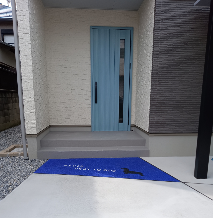 守山市 S様邸 玄関で愛犬がお出迎え シンプルな外構の中にひと際目を惹くのが、ブルーの「ペイブリーアート」。愛犬猫家にはたまらない天然石のワンポイントエンブレムや犬猫のシルエットとフロアの組み合わせで、お気に入りのスペースが完成。玄関を出入りするたびに癒されます。