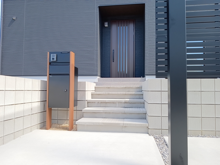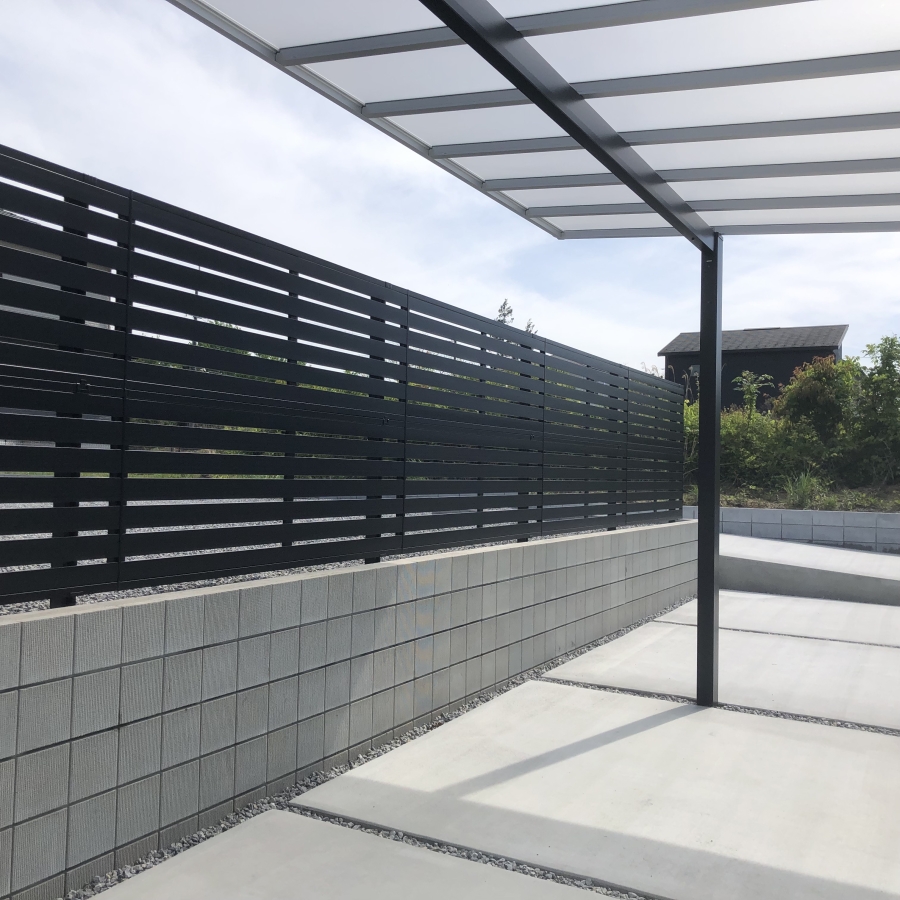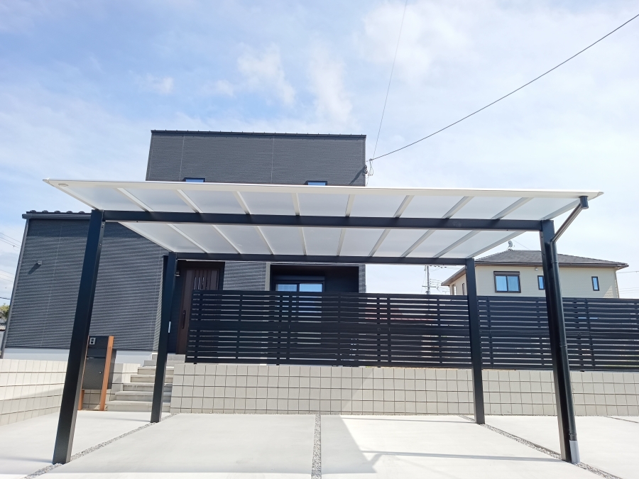 蒲生郡 T様邸 住まいと調和するブラックモダン外構 建物のデザインを引き立てるすっきりとした駐車スペースを実現。ブラックで統一されたカーポートと目隠しフェンスがお家と調和して美しいです。広々とした駐車スペースを確保しながら、住まいのプライバシーもしっかりと守るデザインを実現しました。