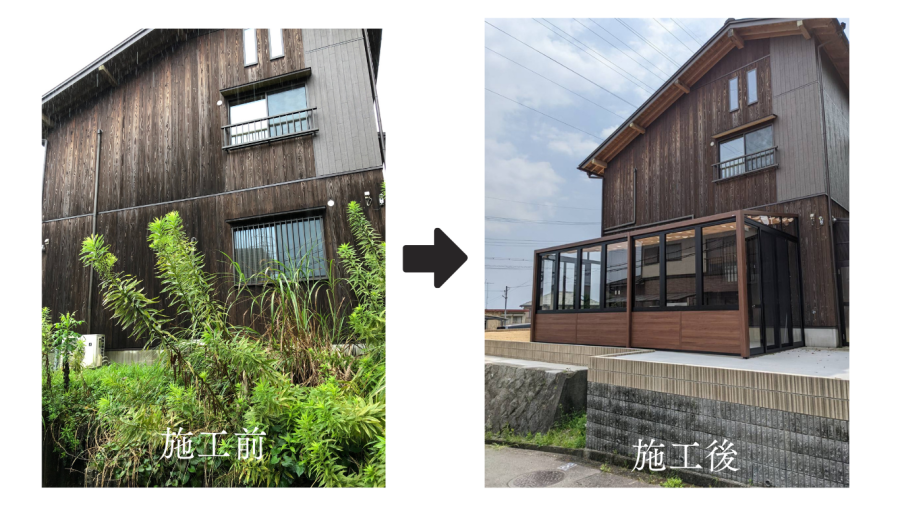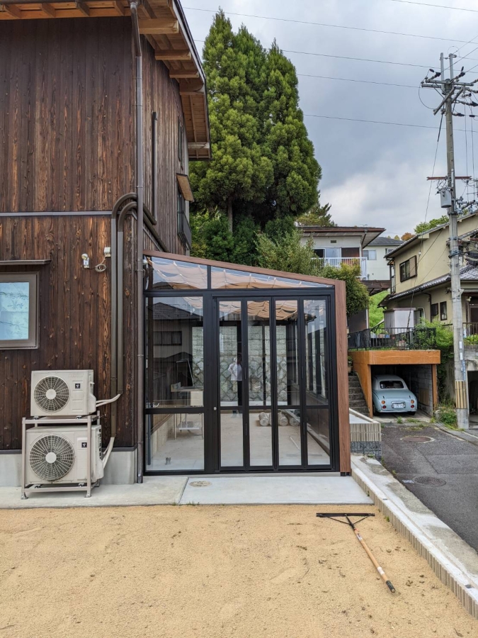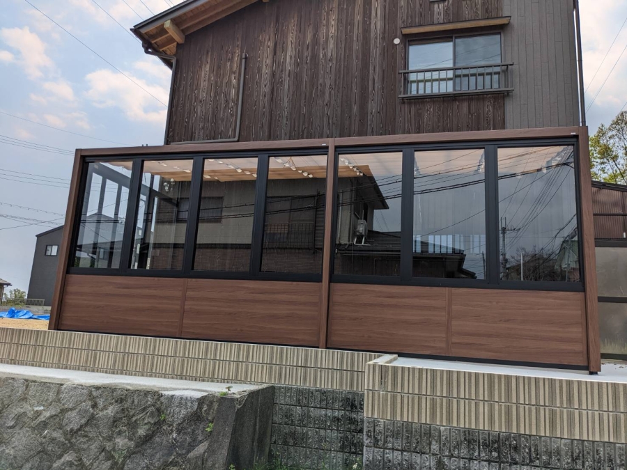 大津市 K様邸 明るいガーデンルームに変貌 屋外の解放感を楽しめるガーデンルーム。屋根には開閉可能な内部日よけを取り付け、日差しの角度によって調整できます。リビングの様にくつろいだり、BBQを楽しんだり、生活スタイルによって様々な楽しみ方ができます。