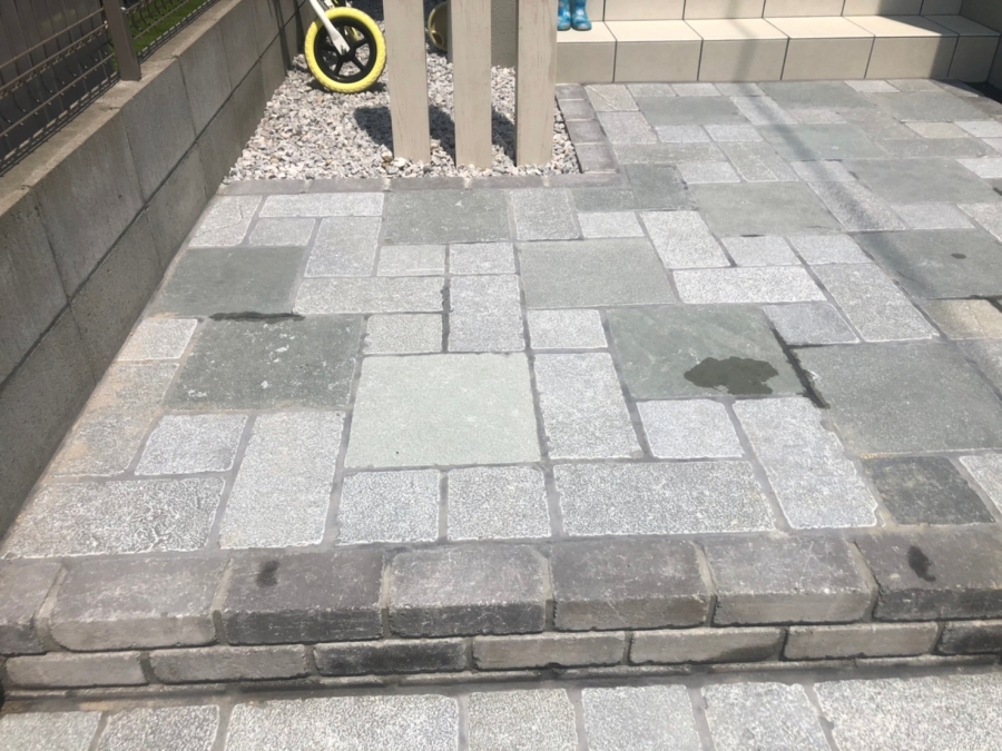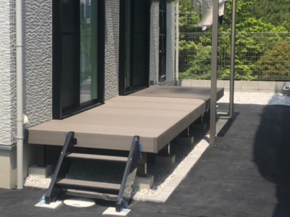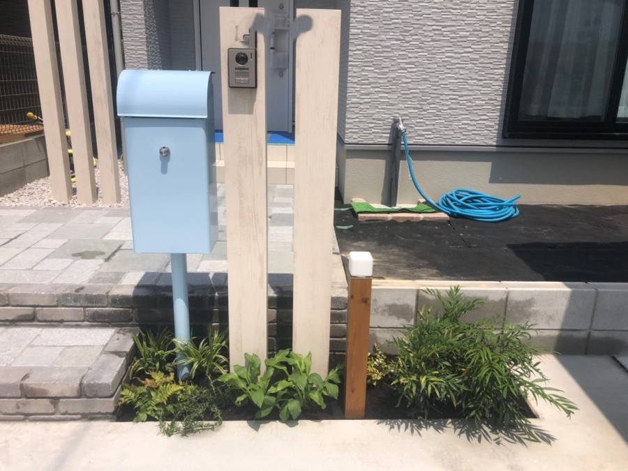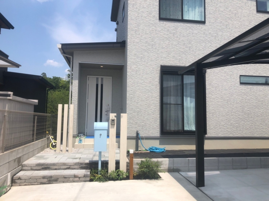 大津市 S様邸 ワイドカーポートで大切な愛車を守る 2台分の駐車が可能なワイドタイプのカーポート。スタイリッシュなブラックのフレームが外構全体を引き締めます。玄関アプローチには明るい木目調の枕木材を前後にずらして配置することで奥行きと立体感が生まれます。