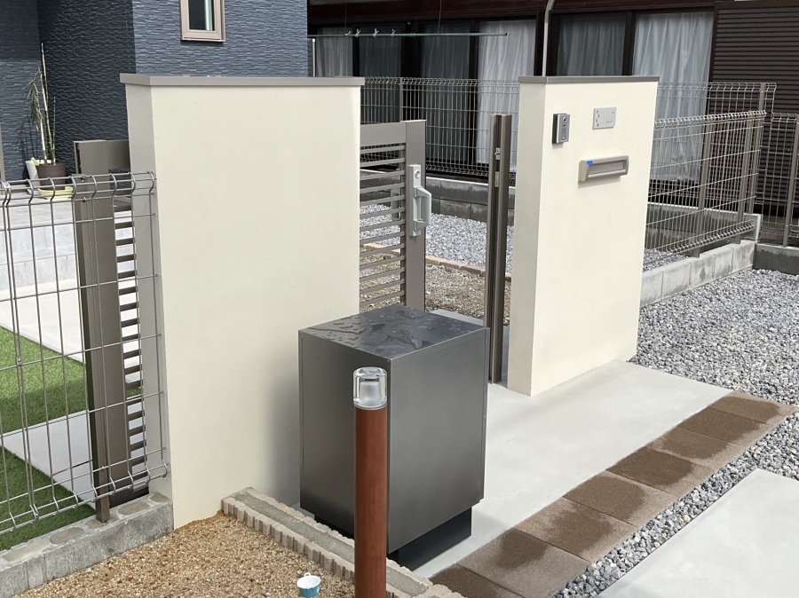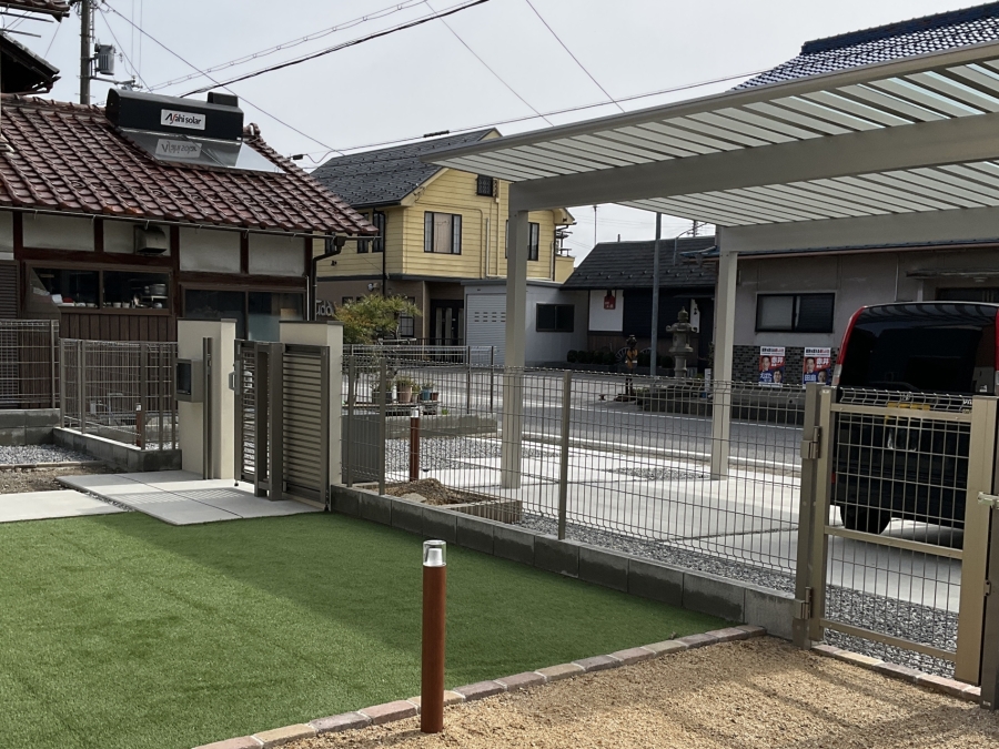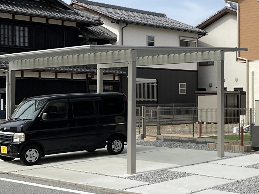 彦根市 K様邸 広々コンクリートデザインのカースペース 柱が少なく開放的な構造のカーポート。駐車スペース全体を明るく保ち、出入りのしやすさも確保。塗り壁の門柱が優しい風合いを醸し出し、コンクリートの無機質感に温かみを加えています。