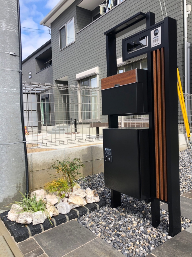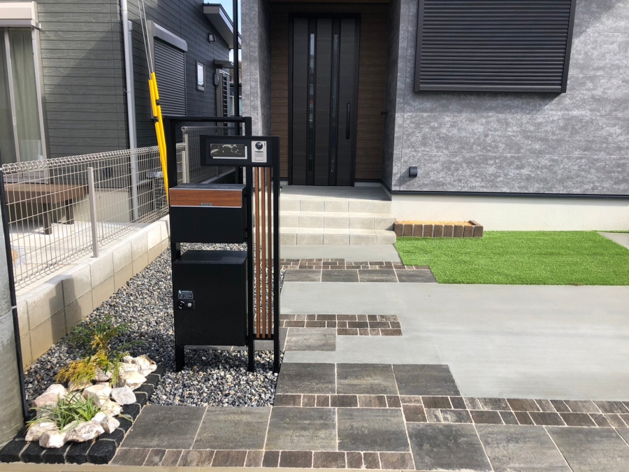 大津市 K様邸 石畳のような風合いのアプローチ 重厚な風合いと存在感のある石板×石畳風の平板の組み合わせで、奥行きのあるアプローチに。人工芝のグリーンがダークトーンの空間に色彩をプラスして明るい印象に。