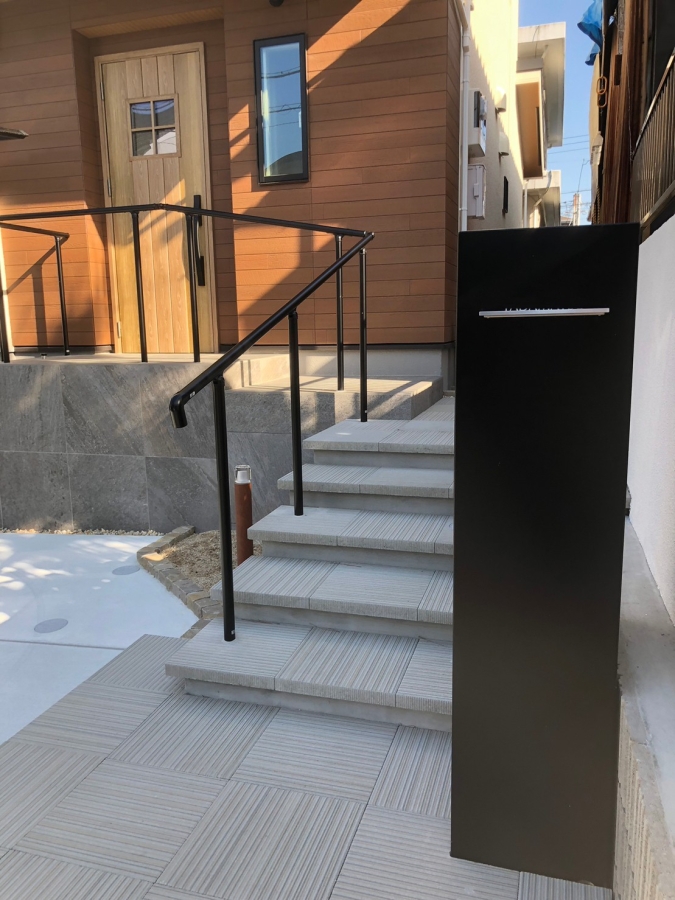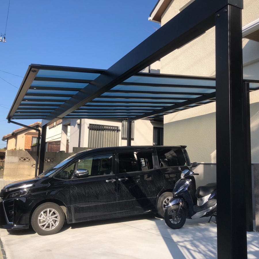 栗東市 T様邸 延長梁のカーポートでシンボリックなエントランスゲートを演出 カーポートの梁を延長することで通常の柱位置よりも駐車スペースにゆとりが生まれ、大きな車でもスムーズに出し入れが可能。黒を基調としたシャープなフレームがお家全体の印象を格上げします。