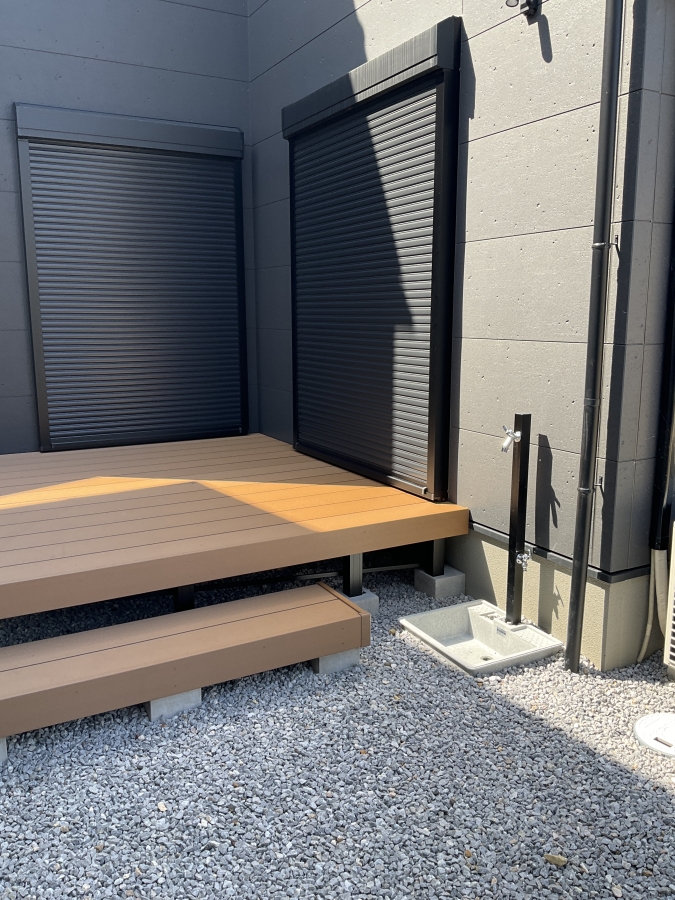 栗東市 モデルハウス お手入れ簡単 人工木ウッドデッキ モデルハウスの外構を施工させて頂きました。ポイントとなるウッドデッキはLIXILの「樹ら楽」。人工木材で、腐食しにくい・色褪せしにくい・汚れが付きにくいなど、高い耐久性とメンテナンスの容易さでとても人気のあるウッドデッキです。